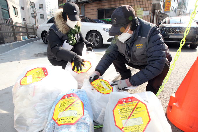 16일 서울 동작구 사당동 주택가 밀집지역에서 구청 관계자들이 배출 시간 및 장소를 위반한 종량제 봉투에 ‘쓰레기 무단투기’ 적발 스티커를 부착하고 있다.