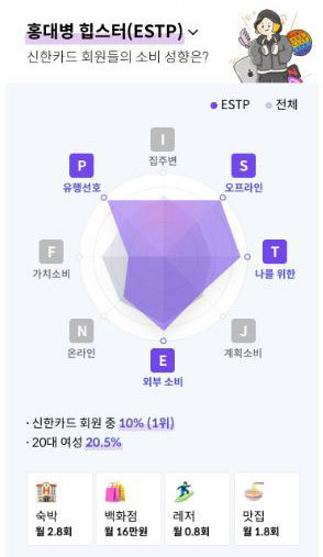 신한카드는 소비유형을 장소, 방식, 우선순위, 가치기준 등 네 가지 기준으로 구분해 △외부·원거리형 E(Extraversion) △집 근처 I(Introversion) △오프라인·체험형 S(Sensing) △온라인 N(iNtuition) △사고적·자기중심형 T(Thinking) △감정적·공동체중심형 F(Feeling) △계획형 J(Judging) △유행선호형 P(Perceiving) 등 8개 유형을 도출했다.