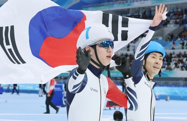 두 선수는 4년 전 매스스타트 결승이 끝났을 때처럼 태극기를 마주 잡았다.