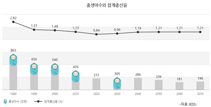 여성 한 명이 평생 낳을 것으로 예상되는 합계출산율이 지난해 0.81명까지 떨어지면서 이 같은 초저출산 가속화 ‘사태’가 언제까지 계속될지 우려가 커지고 있다. 주출산인구 감소, 혼인 기피와 출산연령 상승 등 부정적인 상황이 이어지고 있지만 정부는 조심스럽게 2024년 0.7명대에서 바닥을 찍고 이후 회복할 것으로 전망하는 것으로 나타났다.