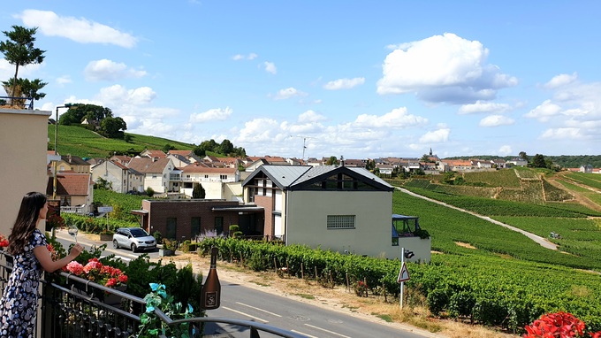꼬뜨 드 블랑에서 최고 품질의 샤르도네가 생산되는 그랑크뤼 마을중 크라망(Cramant)에서 샤르도네 위주로 샴페인을 빚는 보아랑 쥐멜(Voirin Jumel)을 찾아 에페르네(Epernay)로 떠납니다. 랭스 중앙역에서 TER을 타면 20분만에 에페르네역에 닿습니다. 차를 렌트하지 않았다면 그랑크뤼 마을들을 둘러보는 여행은 택시가 가장 편합니다. 높고 낮은 언덕을 따라 포도밭이 끊임없이 펼쳐지는 아름다운 풍경을 즐기며 10여분 정도 시골길을 달리다 리베라시옹(reu de la liberation) 도로로 접어드니 길 양옆에 샴페인 하우스들이 줄지어 나타나고 ‘보아랑 쥐멜 퀴베 555’를 간판으로 내건 아담한 보아랑 쥐멜 와이너리를 만납니다. 와이너리를 이끄는 파트릭(Patrick)과 딸 줄리에(Julie), 폴랭(Pauline) 자매가 반갑게 맞이합니다. 그들을 따라 2층 테라스 와인바로 올라갑니다. 서너명의 여행자들이 왁자지껄 떠들며 샴페인을 마시네요. 높고 낮은 언덕을 따라 물결치듯 펼쳐지는 아름다운 크라망 포도밭를 즐기며 마시는 샴페인이라니!
