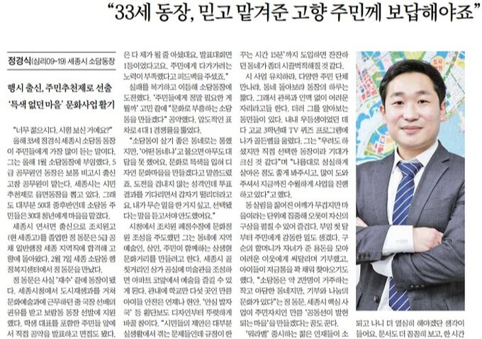 일선 동장이 되기 전에는 세종시청 도시재생과, 문화예술과 등에서 초보 행정가로서 경험을 쌓았다. 선배 공무원의 권유로 처음 일선 동장에 응모했을 때는 솔직히 걱정이 앞섰다. 그는 총동창신문과의 인터뷰에서 “주민들에게 정말 필요한 게 뭘까 고민한 끝에 문화로 부흥하는 소담동을 만들겠다고 공약했다”며 “결국 압도적인 표차로 4 대 1의 경쟁률을 뚫었다”고 소개했다.
