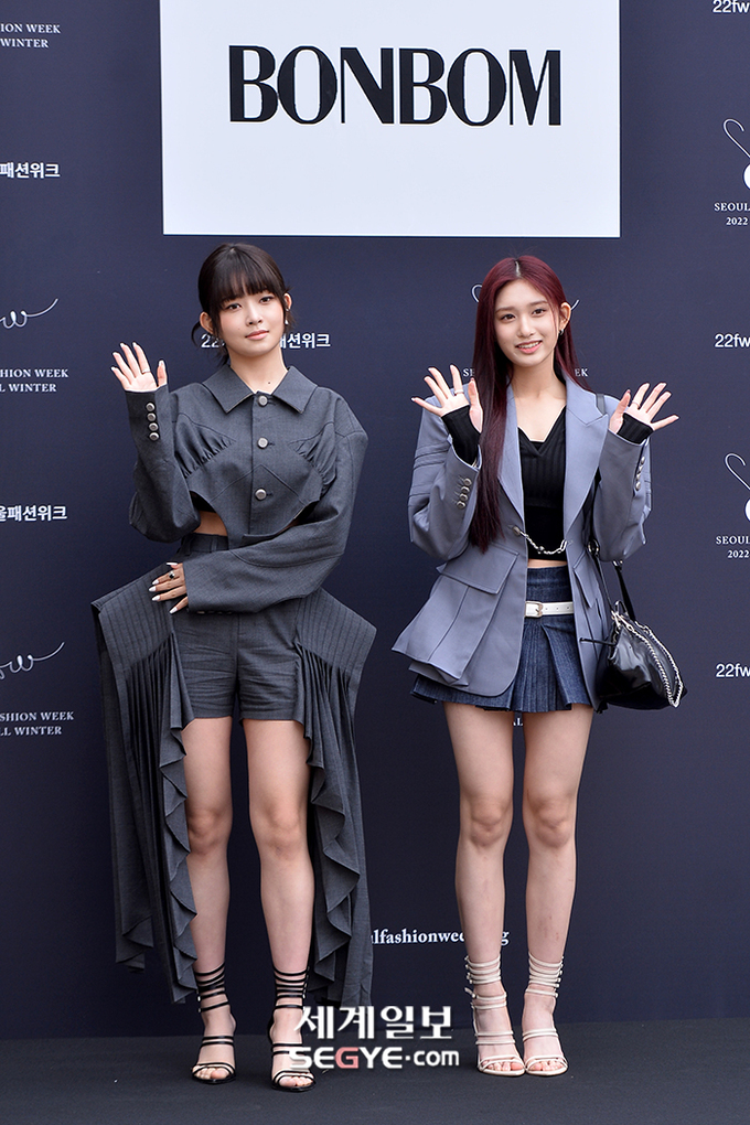 걸그룹 아이브 레이(사진 왼쪽)와 이서가 18일 오후 서울 서울공예박물관에서 열린 '2022FW 서울패션위크' 본봄(BONBOM)컬렉션에 참석해 포즈를 취하고 있다.
