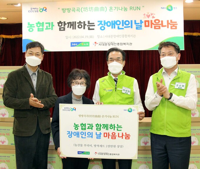 농협중앙회(회장 이성희)는 장애인의 날을 하루 앞둔 19일 서울시 서대문장애인종합복지관을 찾아 우리 농산물과 방역용품 등 2천만원 상당의 생필품을 전달하고, 이성희 회장 등 임직원들이 발달 장애 청년들과 함께 관내 장애인 가정에 배달될 나눔 키트 상자를 직접 만들며 사랑의 온기를 나누는 뜻깊은 시간을 가졌다.