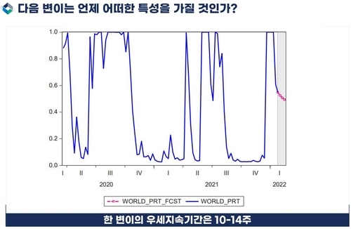 이날 발표자로 나선 정재훈 가천대학교 의과대학 예방의학교실 교수도 지금까지 한 변이의 우세 지속기간이 10∼14주였다는 점을 바탕으로 새 변이는 BA.2(스텔스오미크론)의 우세종화 시점 10∼14주 후인 올해 하반기에 중규모 유행이 나타날 것으로 봤다.