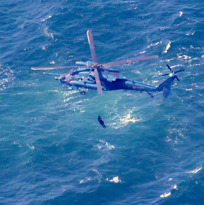 일본 홋카이도 시레토코반도 인근 바다에서 24일 해상자위대 헬기의 로프에 매달린 구조 다이버가 침몰 관광선 승선자 탐색 작업을 하고 있다. 23일 오후 1시15분쯤 일본 홋카이도 시레토코반도 앞바다에서 승객 24명, 선원 2명 모두 26명이 승선한 관광선에서 침수가 발생했다는 보고가 있은 뒤 해상보안청 등이 악천후 속에서 수색작업에 나서 9명을 구조해 병원으로 이송했는데 8명은 의식 불명상태다.