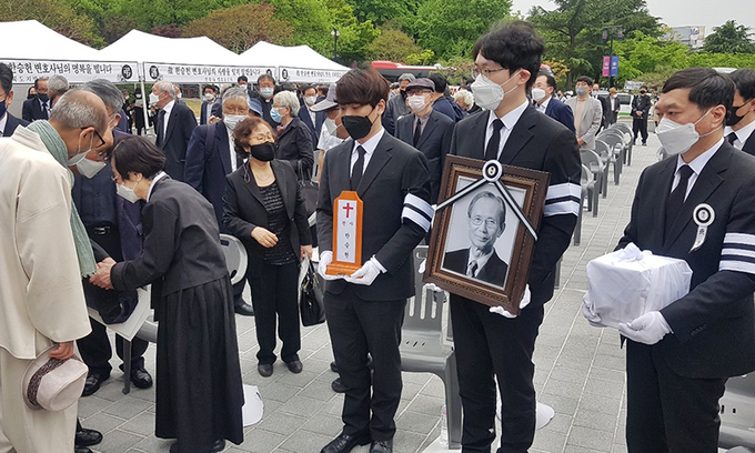 오랫동안 인권변호사로 민주화운동에 헌신하다 88세를 일기로 타계한 한승헌 전 감사원장을 추모하는 행렬은 25일 오후 노제가 열린 그의 모교 전북대에서도 이어졌다. 고인의 운구가 안장되기 전 마지막으로 대학 본관 앞 광장에 도착하자 교수와 학생, 민주사회 인사, 시민 등 300여명은 헌화와 묵념으로 고인을 추모하며 배웅했다.
