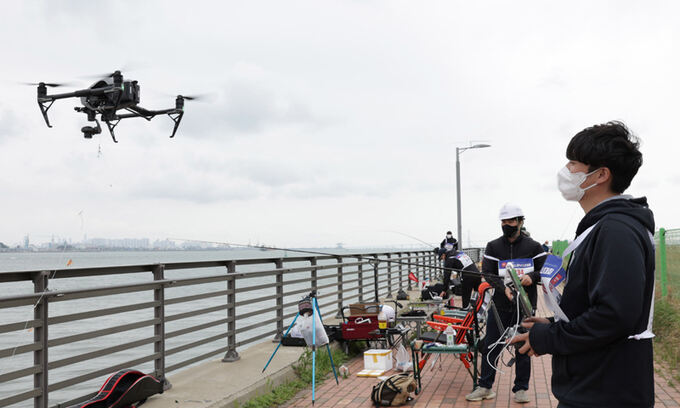4월의 마지막 날인 30일 서해가 바라보이는 인천 영종도의 구읍뱃터. 수십 명의 강태공들이 수천 년 동안 이어 온 익숙한 레저활동인 낚시를 즐기고 있었다. 그런데 그 모습이 사뭇 새롭다. 낚싯대, 미끼와 함께 드론 장비들이 나란히 놓여 있는 것. 미끼가 달린 낚싯줄을 걸고 하늘을 나는 드론의 모습도 보인다. 이 드론의 조종간을 잡고 있는 이의 표정이 사뭇 진지하다. 세계일보가 개최한 ‘세계드론낚시대회’의 풍경이다.