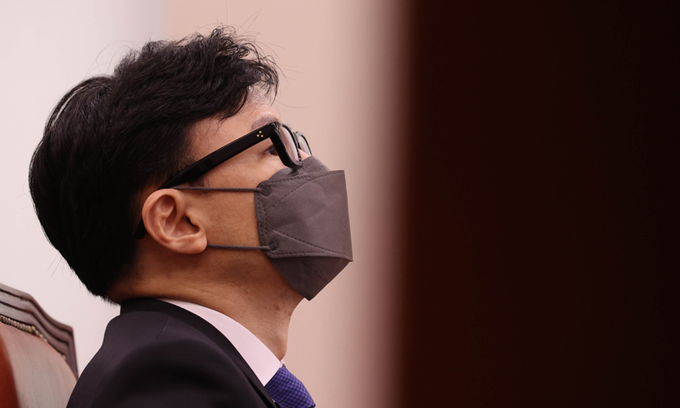 한동훈 법무부 장관 후보자가 9일 서울 여의도 국회에서 열린 인사청문회에 출석해 의사진행 발언을 듣고 있다. 뉴시스