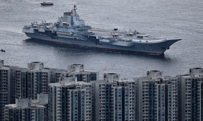 중국의 첫 항공모함 랴오닝(遼寧)함이 2017년7월7일 홍콩 앞바다로 들어오고 있다. 랴오닝함은 이날 홍콩의 중국 반환 20주년 기념을 위해 다른 3척의 중국 군함과 함께 홍콩에 도착, 5일 간 홍콩의 칭이섬에 정박한다. 홍콩=AP뉴시스