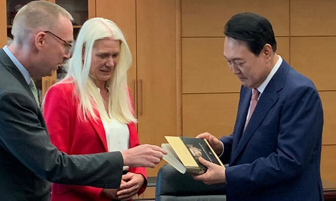 이날 콜린 크룩스 주한 영국대사의 사회관계망서비스(SNS)를 보면 윤 대통령을 예방해 존슨 총리의 친필 서명이 들어간 저서 ‘처칠 팩터’를 선물하는 사진이 게시돼 있다. 대통령 취임식에 맞춰 영국 정부가 특사로 보낸 아만다 밀링 외교부 아시아·중동 담당 차관도 함께했다. 사진 속 윤 대통령은 흐뭇한 표정으로 책 표지를 넘겨보고 있다.
