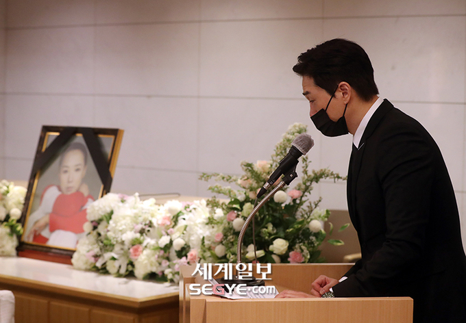 11일 오전 서울 강남구 삼성서울병원 장례식장에서 열린 영화배우 고 강수연 영결식에서 배우 유지태가 사회를 보고 있다.