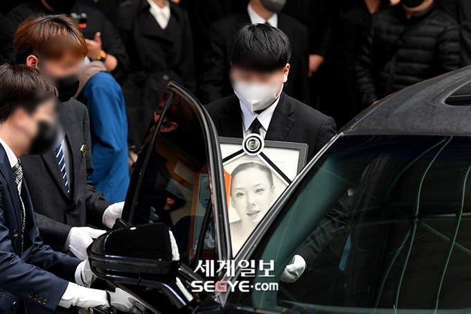 11일 오전 서울 강남구 삼성서울병원 장례식장에서 배우 故 강수연의 영결식과 발인이 진행된 가운데 영정 사진이 운구차에 오르고 있다.
