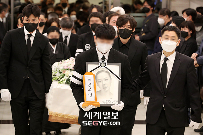 배우 고 강수연의 발인이 11일 오전 서울 강남구 일원동 삼성서울병원 장례식장에서 엄수됐다. 동료 배우 정우성, 설경구 등이 마지막까지 고인을 배웅하고 있다.