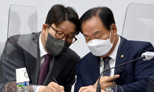 국민의힘 권성동 원내대표와 한기호 사무총장이 12일 국회에서 열린 원내대책회의에 참석해 현안을 논의 하고 있다. 뉴시스