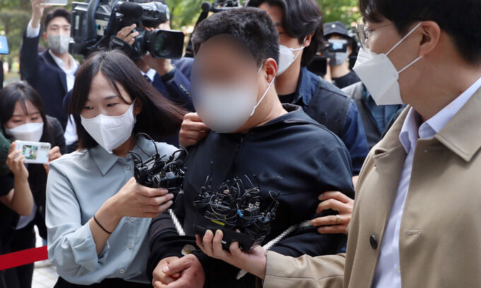 이날 오전 10시23분께 경찰 호송차에 실려온 A씨는 마스크 위로 웃는 듯 보이는 표정을 지은 채 건물 안으로 들어갔다. '왜 죽였느냐', '돈을 훔치려고 죽였느냐', '마약 혐의도 인정하느냐', '마약은 어디서 했느냐', '피해자에게 미안하지 않느냐' 등 취재진 질문에는 아무런 답을 하지 않았다.
