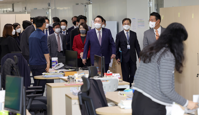 13일 유튜브 채널 KTV국민방송, YTN 돌발영상은 윤 대통령이 지난 11일 서울 용산 대통령실 청사 사무실을 순방하며 대통령실 직원들과 대화를 나누는 모습을 촬영해 보도했다.
