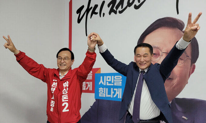 이어 박 후보와 손 잡고 지지자 들을 향해 “경선 과정에서의 일은 모두 잊고 모두 화합과 단결로 박상돈 후보와 원팀이 되어 박후보를 반드시 천안시장으로 만들자”고 말했다.