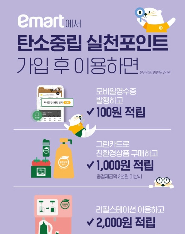 자동 적립을 위해서는 먼저 탄소중립 실천포인트 홈페이지에 가입해야 한다. 이후 이마트에서 탄소중립 실천 포인트가 연계된 상품을 구매하거나 모바일 영수증을 발급 받고 신세계 포인트를 적립하면, 자동으로 시스템이 연계돼 탄소중립 실천 포인트가 쌓인다. 전자영수증 발급시 100원, 리필스테이션 이용시 2000원이 포인트가 각각 적립된다.