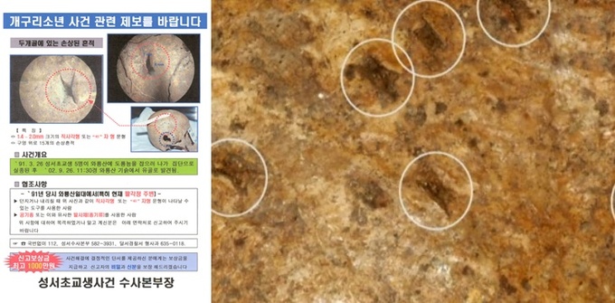 이어 A씨가 공개한 사진에는 당시 해당 사건과 관련한 제보를 받은 전단의 모습이 담겨 있다. 특히 해당 전단에는 숨진 아이들의 두개골 손상 흔적이 포함돼 눈길을 끌었다.