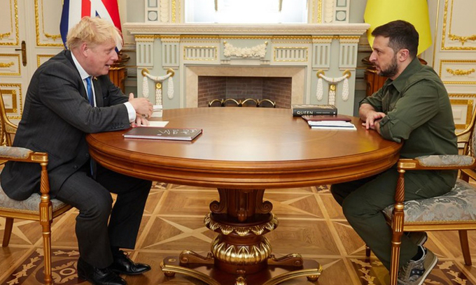보리스 존슨 영국 총리(왼쪽)가 지난 17일(현지시간) 우크라이나 수도 키이우를 방문해 볼로디미르 젤렌스키 우크라이나 대통령과 정상회담을 하고 있다. 존슨 총리 SNS 캡처