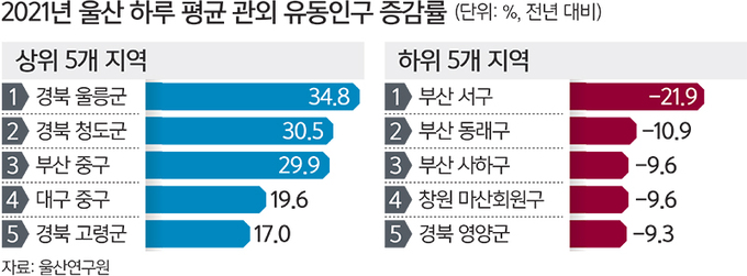 지난 2년간 부산·경남을 향한 인구수는 대구·경북에 비해 많지만 증가율을 대구·경북이 높았다고 연구원 측은 설명했다. 시·군·구별로 세분화하면 주말에 경북 경주시를 찾은 울산시민이 6만3080명으로 가장 많았다. 2020년과 비교해도 6.8% 늘어난 수치다. 다음으로는 부산 기장군(2만2557명), 경남 양산시(1만9526명), 부산 해운대구(1만2063명), 부산진구(8154명) 순이었다.