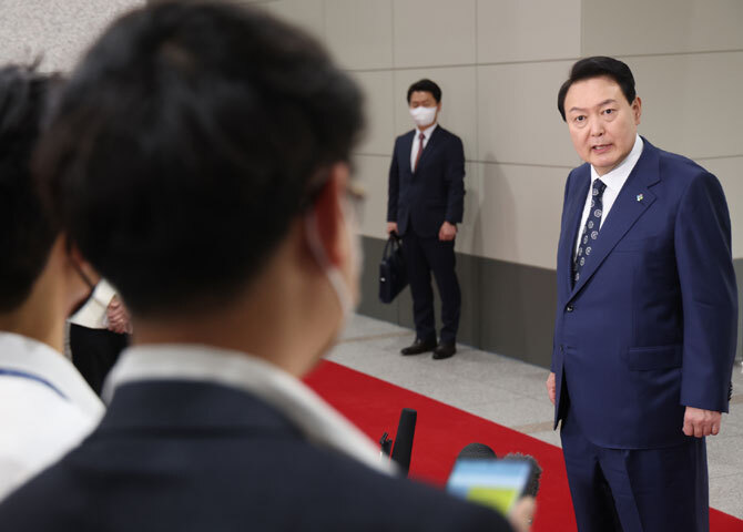 이후 발걸음을 옮기던 윤 대통령은 '대선 때 약속했던 (김건희 여사의) 조용한 내조는 끝난 것인가'라는 추가 질문에 답하지 않고 그대로 집무실로 이동했다.