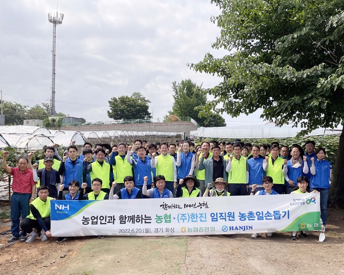 농협중앙회(회장 이성희)는 20일 ㈜한진 임직원들과 함께 경기도 화성시 송산면 소재 포도농가를 찾아 영농철 농촌일손돕기에 나섰다.