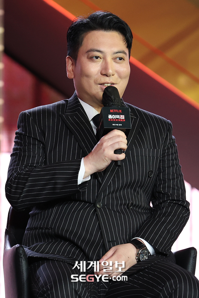 배우 박명훈이 22일 오전 서울 코엑스에서 열린 넷플릭스 오리지널 시리즈 '종이의 집: 공동경제구역'의 제작보고회에 참석해 인사말을 하고 있다.