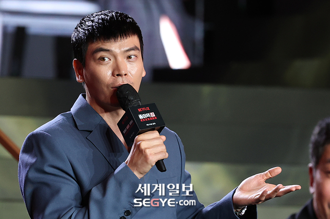 배우 김성오가 22일 오전 서울 코엑스에서 열린 넷플릭스 오리지널 시리즈 '종이의 집: 공동경제구역'의 제작보고회에 참석해 인사말을 하고 있다.