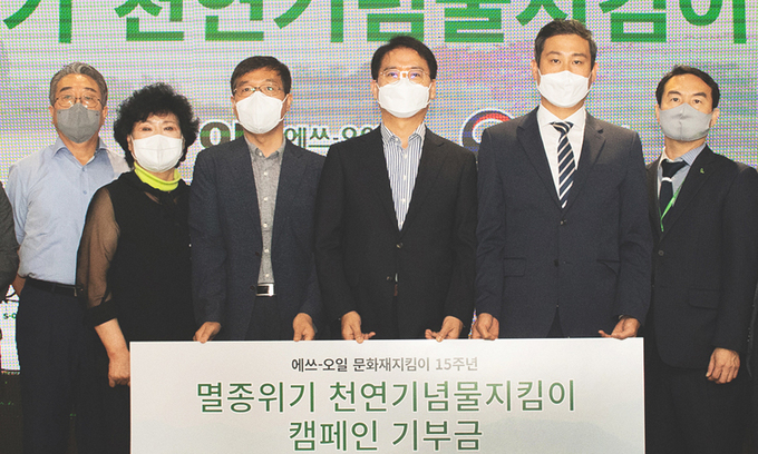 S-OIL(에쓰오일)과 문화재청은 22일 환경단체에 멸종위기 천연기념물 지킴이 후원금 1억5000만원을 전달했다고 밝혔다. 류열 S-OIL 사장(왼쪽 네 번째)을 비롯한 환경단체 관계자들이 기념촬영을 하는 모습.