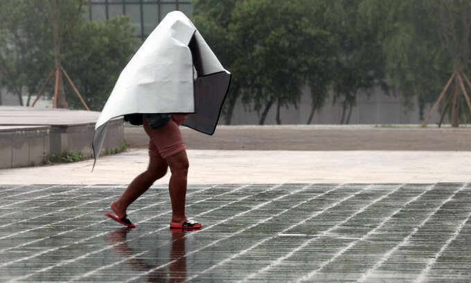 비가 내리고 있는 23일 오전, 한강에서 한 시민이 돗자리를 쓰고 걸어가고 있다. 이날 기상청은 서울, 경기, 인천 등에 호우예비특보를 내렸다.
