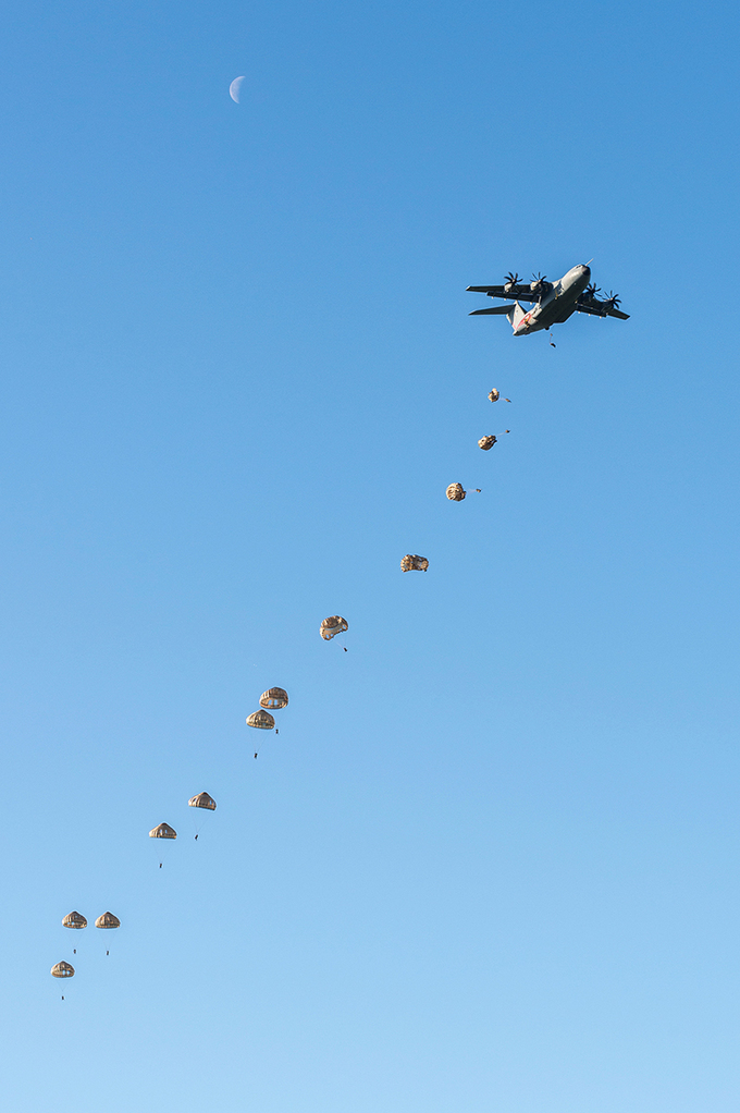 우크라이나 사태로 발트해 연안의 긴장이 고조하는 22일(현지시간) 나토(북대서양조약기구) 임무 수행차 에스토니아에 전개된 프랑스 육군 제11공수여단 부대원들이 낙하산을 타고 수송기에서 강하하고 있다. 발트해 연안의 리투아니아가 러시아 본토와 역외영토 칼리닌그라드를 연결하는 철도화물운송을 차단해 러시아 정부가 반발한 데 이어 에스토니아는 러시아 국경수비대 헬리콥터가 영공을 침범했다고 항의하는 등 마찰이 벌어지고 있다.