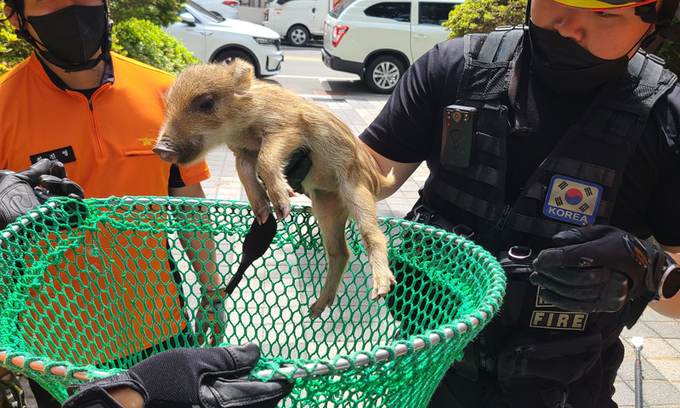 28일 포항북부소방서 등에 따르면 이날 오전 9시39분쯤 북구 장성동 모 아파트 화단에서 새끼 멧돼지 두 마리가 배회한다는 주민 신고를 받고 출동한 소방관에 의해 발견됐다.