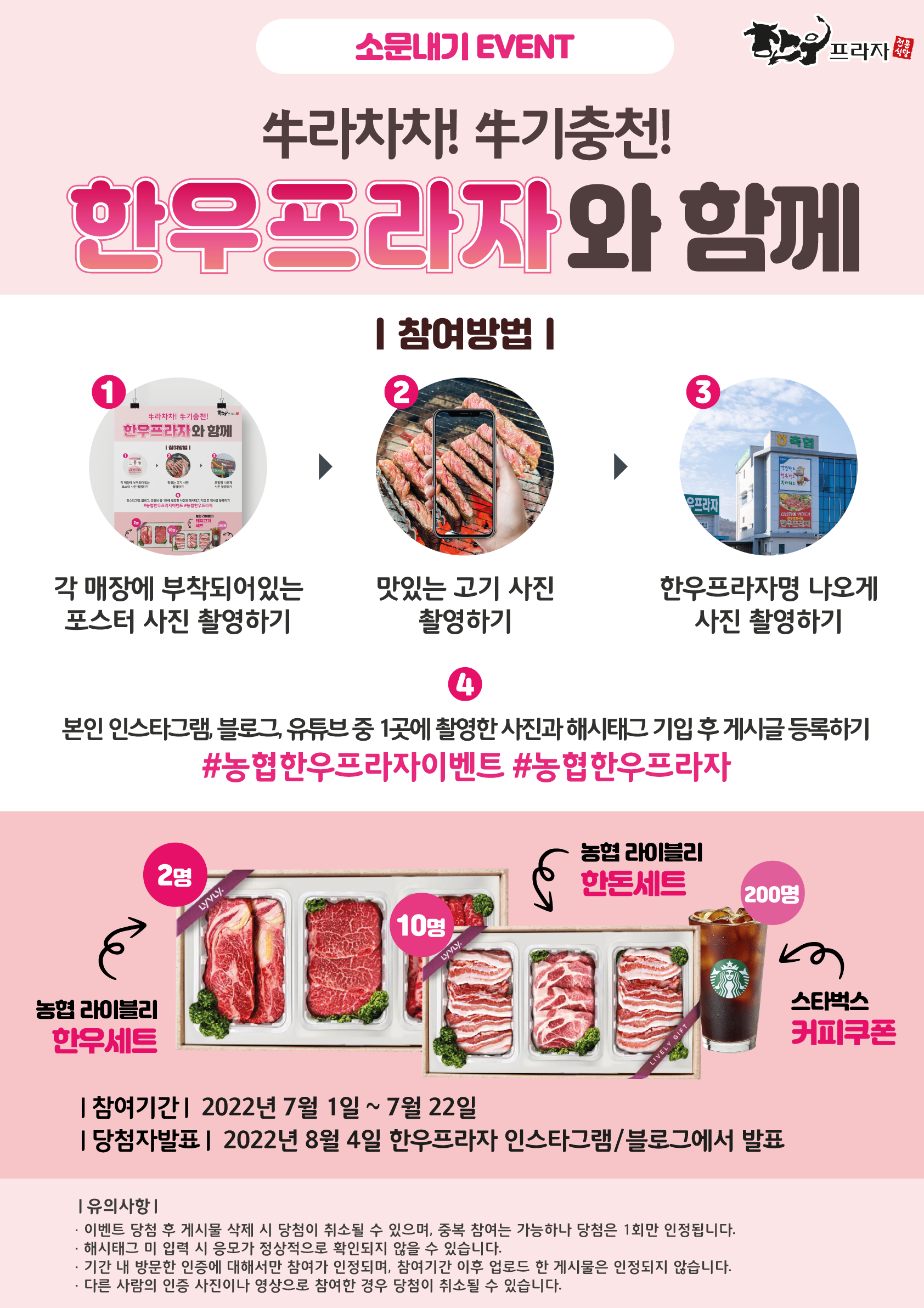 이번 행사는 SNS를 통해 전국 농·축협이 운영하는 한우프라자를 홍보하고, 한우소비 촉진을 통한 농가의 실익 향상을 위해 준비되었으며, 참여방법은 전국 한우프라자 식당형 매장(총 99개소)내 부착된 포스터, 맛있는 고기와 방문 한우프라자명을 촬영 후 본인의 인스타그램, 블로그, 유튜브 중 한 곳에 촬영사진과 함께‘#농협한우프라자 #농협한우프라자이벤트’해시태그 및 게시글 공유 후 댓글을 남기면 된다. 추첨을 통해 농협라이블리 한우 및 한돈세트, 커피쿠폰을 증정하며 당첨자는 8월 4일 한우프라자 인스타그램과 네이버 블로그를 통해 발표할 예정이다.