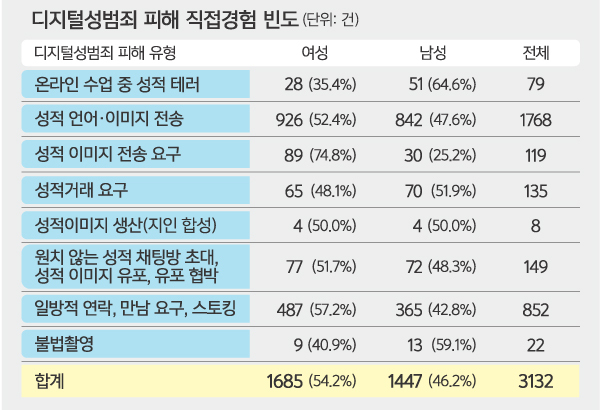 아동·청소년 디지털성범죄 피해자 10명 중 6명은 성적 언어·이미지를 받거나 전송을 요구당하는 피해를 경험한 것으로 나타났다. 남성과 여성이 디지털성범죄 심각성 인식에서 큰 차이를 보이는 가운데 여성은 주로 모르는 사람으로부터, 남성은 선후배나 친구 또래집단에게 피해를 받는 경우가 많아 대조를 이뤘다.