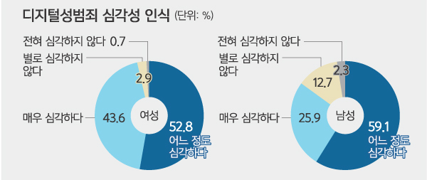 보고서는 “여성은 누구인지 모르는 사람으로부터 느닷없이 겪는 피해 비중이 높다”며 “남성은 또래나 선후배 사이에서 디지털성범죄를 성을 매개로 행하는 집단적 ‘놀이’로 오인하는 행태를 보인다”고 설명했다. 보고서는 이 같은 현상의 원인을 디지털성범죄를 바라보는 남성과 여성의 상반된 인식에서 찾았다.