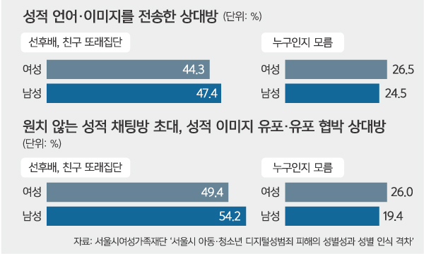주목할 점은 남성은 선후배나 친구 또래집단으로부터, 여성은 누구인지 모르는 사람으로부터 성적 침해 사건을 주로 겪었다는 것이다. 아동·청소년이 가장 많이 겪는 성적 언어·이미지 전송 피해는 또래집단으로부터 받는다는 응답이 많았고, 남성(47.4%)이 여성(44.3%)보다 많이 겪었다. 여성은 누구인지 모르는 사람으로부터 수신하는 비율(26.5%)이 남성보다(24.5%) 높았다. 원치 않는 성적 채팅방 초대 및 유포, 유포 협박 가해자가 누구인지 모르는 경우 역시 여성(26%)과 남성(19.4%)의 격차가 컸다.