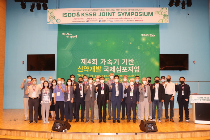 경북 포항시는 과학기술정보통신부, 경북도, (사)한국구조생물학회(KSSB), 포스텍과 공동으로 지난 7일부터 9일까지 포스코 국제관 국제회의장에서 ‘제4회 가속기 기반 신약 개발 국제심포지엄’을 연 가운데 참석자들이 기념 촬영을 하고 있다. 포항시 제공