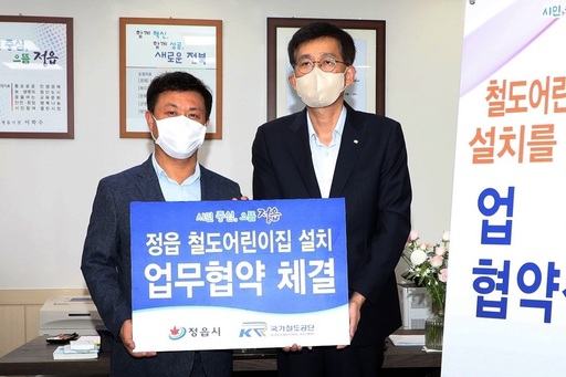 31일 정읍시에 따르면 이학수 정읍시장과 최원일 국가철도공단 호남본부장은 최근 정읍시청에서 정읍 철도어린이집 설치를 위한 업무협약을 체결했다. 협약에 따라 철도공단은 철도 역사 내 유휴 공간을 무상으로 제공해 어린이집을 설치하고 운영 물품을 지원한다. 정읍시는 인허가 등 제반 행정적 절차에 협조하고 위탁 운영자 선정 등을 책임진다. 철도어린이집은 내년 9월 개원을 목표로 사업이 완료되면 전국 다섯 번째, 호남 지역에서는 최초로 철도어린이집이 문을 연다.