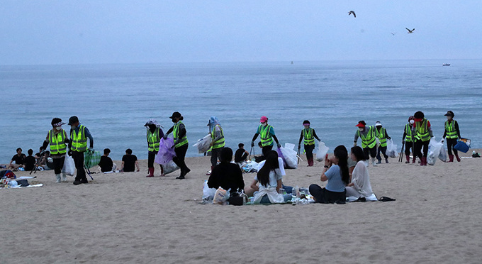피서 절정기인 31일 오전 강원 강릉시 경포해수욕장에서 피서철 임시고용된 환경미화원들이 밤을 새운 피서객들 사이에서 백사장 청소를 하고 있다.