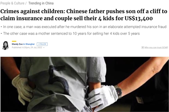 중국에서 보험금을 노리고 10살 아들을 절벽에서 밀어 떨어뜨린 30대 아버지 이야기가 전해져 충격을 주고 있다.
