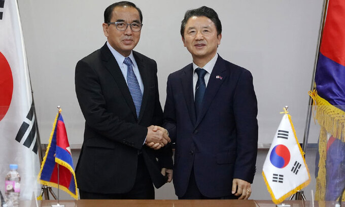 남성현 산림청장(오른쪽)과 벵 사콘 캄보디아 농림수산부 장관이 2일 서울 영등포구 산림비전센터에서 열린 ‘한·캄보디아 산림분야 고위급 면담’에서 악수하고 있다.