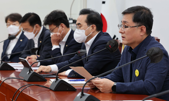 더불어민주당 김성환 정책위의장이 4일 대통령실 관저 공사 수의계약 특혜 의혹과 관련해 "내용을 더 검증해 봐야겠지만 이 정도면 거의 짜고 쳤다고 봐야 되지 않을까 싶다"고 말했다. 또 김건희 여사 논문 표절 의혹을 두고 "같은 대학에서. 문대성 논문은 안 되고 김건희 논문은 되는 이유가 뭔가"라고 비판했다.