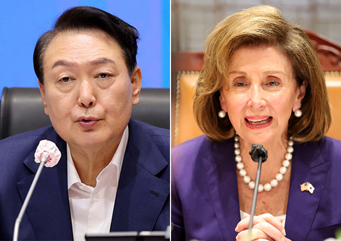 윤석열 대통령은 4일 방한 중인 낸시 펠로시 미국 하원의장과 통화하고 "이번 펠로시 하원의장 일행의 방문이 한미간 대북 억지력의 징표가 될 것"이라고 말했다.