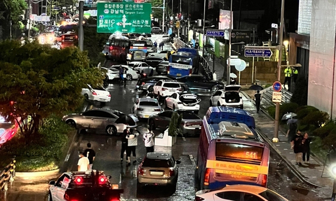 중부지방을 중심으로 내린 폭우로 서울 강남대로 횡단보도에 포트홀이 발생했다.