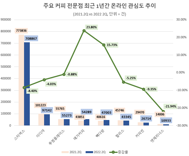 올 2분기 커피전문점 들에 대한 온라인 포스팅 수를 살펴본 결과 '스타벅스'의 독주는 계속됐지만 러-우전쟁으로 인한 여파로 인플레가 심화되면서 지난해에 비해 관심도는 크게 줄어들었다.