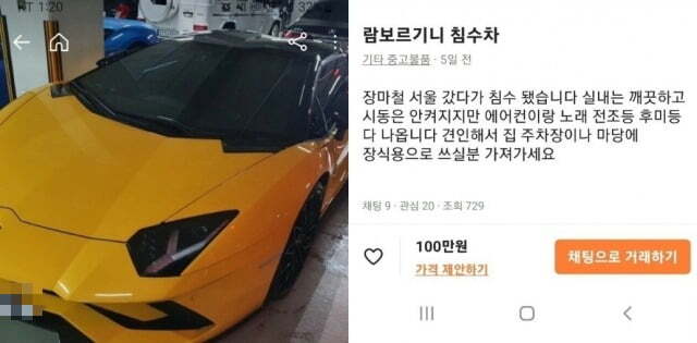지난 16일 한 온라인 커뮤니티에 올라온 100만원짜리 ‘침수’ 람보르기니 중고거래 게시글을 놓고 갑론을박이 이어지고 있는 가운데 실제 차주가 나타났다. 소유주에 따르면 고가의 스포츠카인 이 노란색 람보르기니는 실제 침수된 적도 없다.