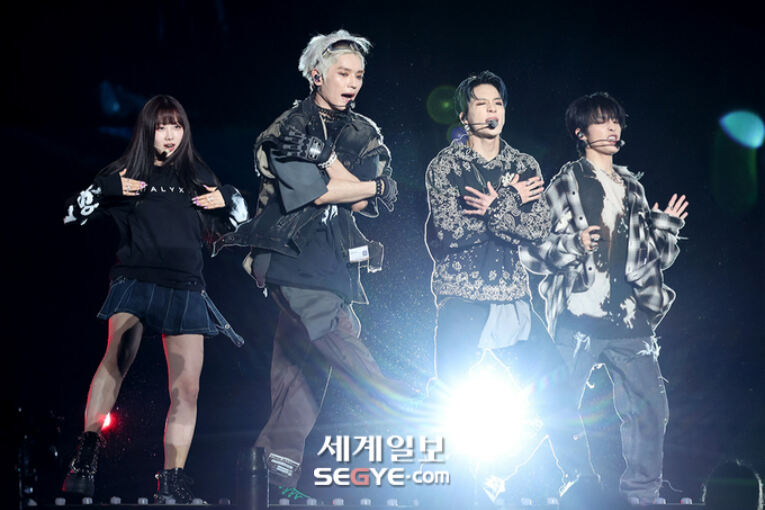 가수 지젤, 태용, 제노, 양양(사진 왼쪽부터)이 20일 오후 경기 수원월드컵경기장에서 열린 'SMTOWN LIVE 2022 : SMCU EXPRESS @HUMAN CITY_SUWON'에서 멋진 무대를 선보이고 있다.