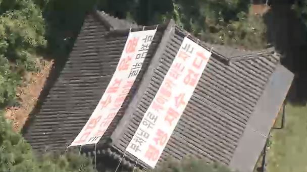 MBC는 지난 23일 경남 사천 각산에 위치한 대방사의 경내 건물 지붕에 이와 같은 내용의 현수막이 걸려있다고 보도했었다.